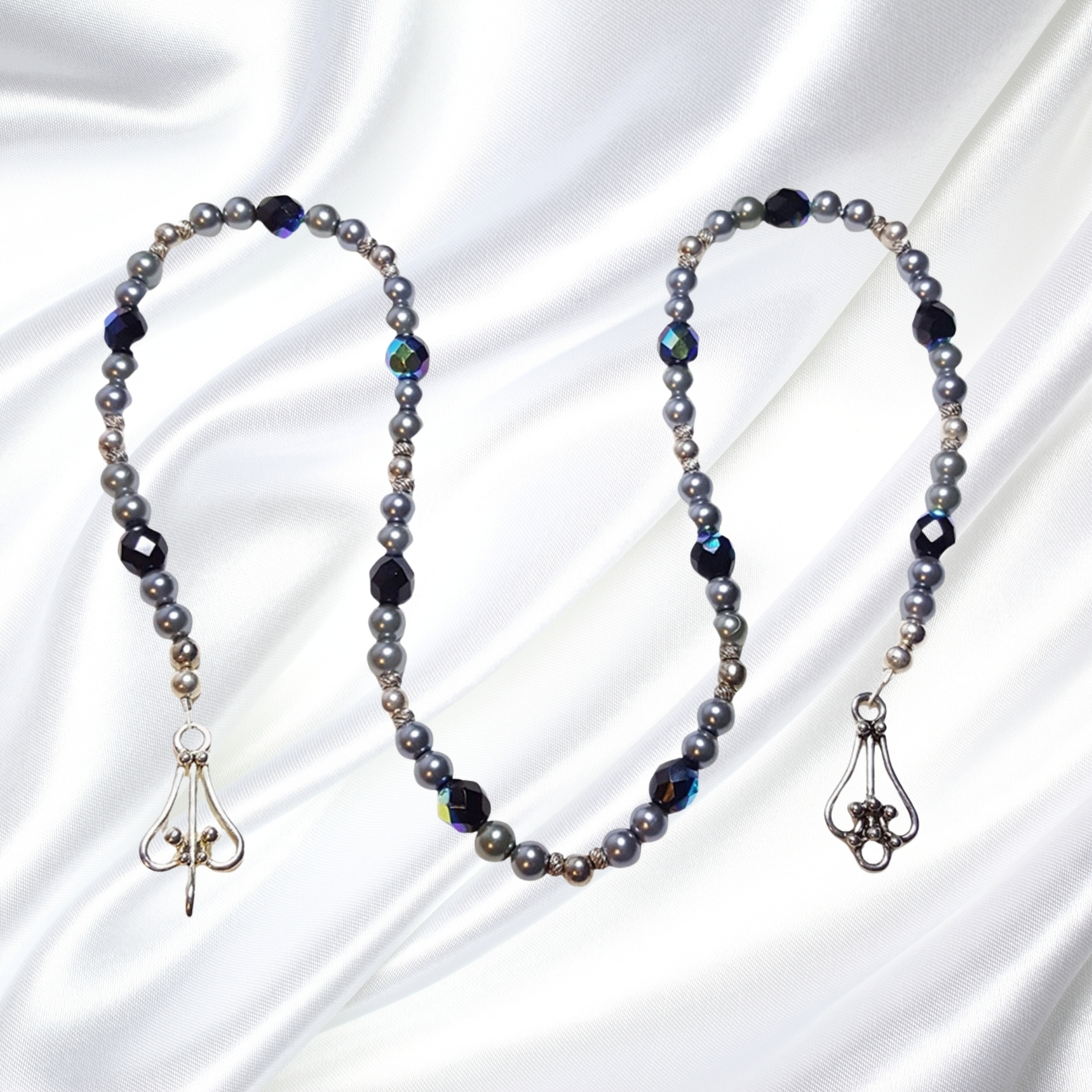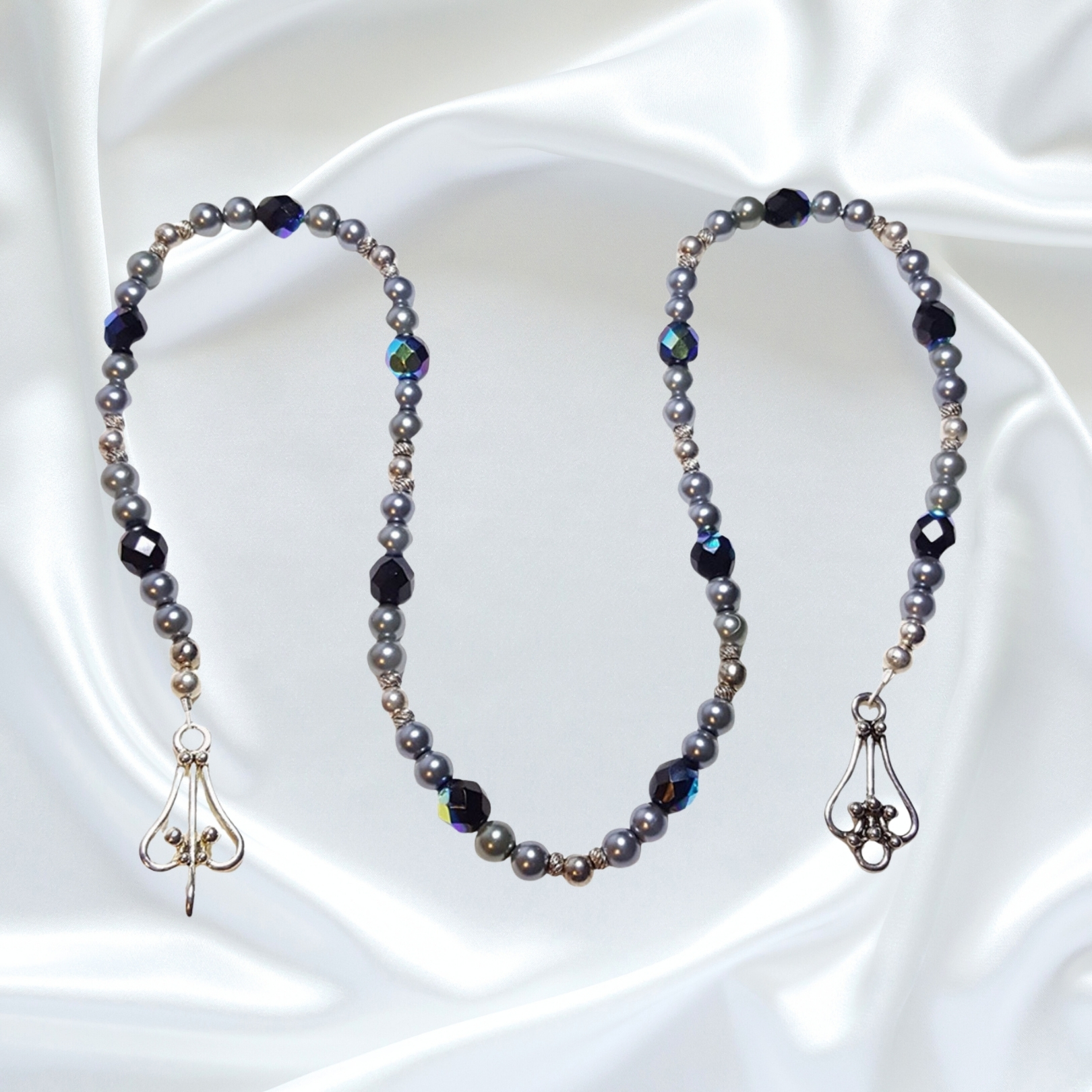 Shimmering gray crystal based pearls and jet black aurora borealis round crystals are accented with antique silver spacer beads to form a gorgeous single strand statement necklace perfect for any occasion..