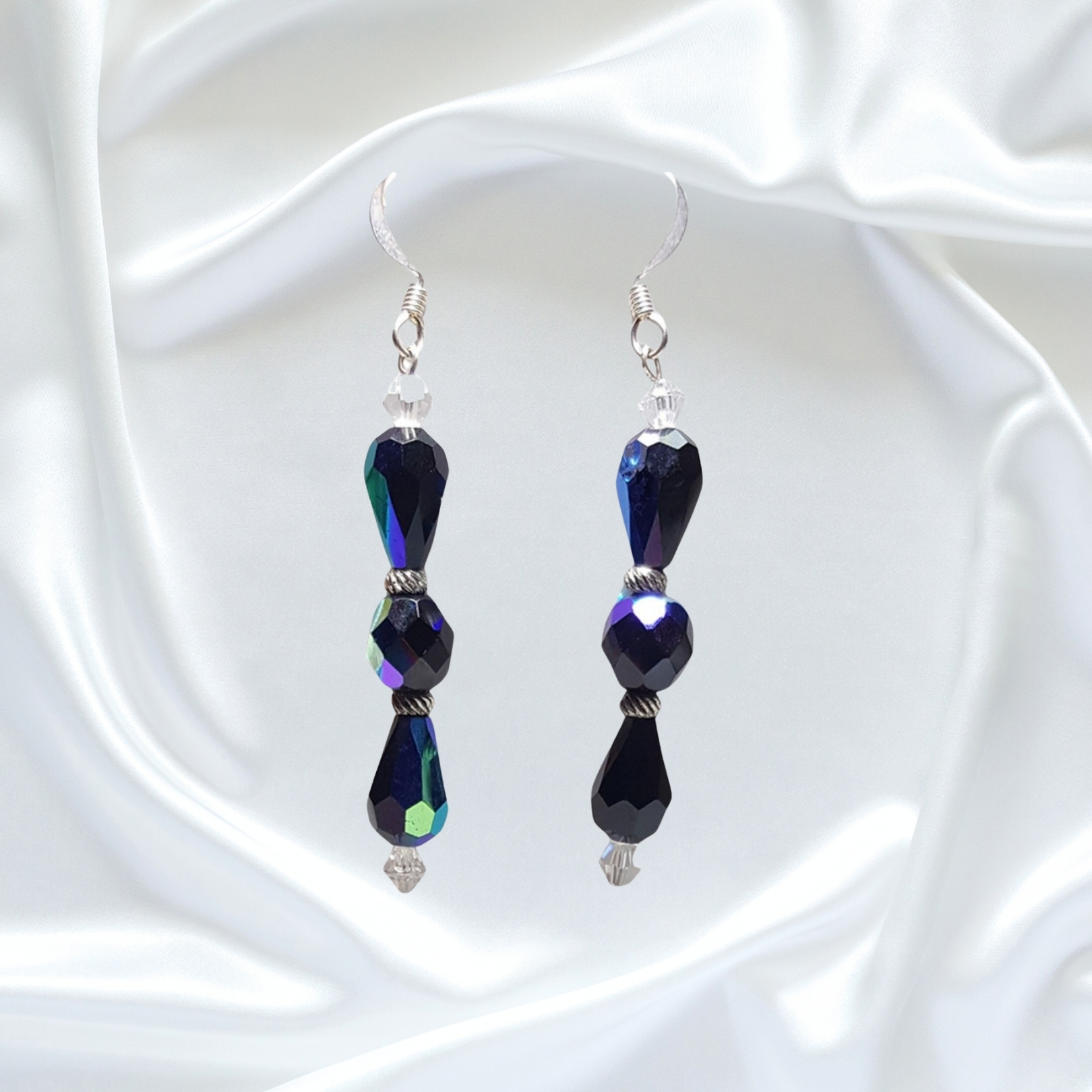 Earrings are dainty and pretty featuring a single matching jet black aurora borealis round crystal in the middle accented with jet black aurora borealis teardrop crystals with matching antique silver spacer beads and clear ice bicone crystals on either end. Full of sparkle!