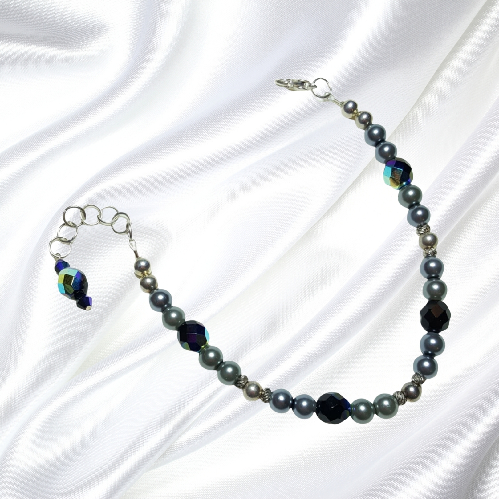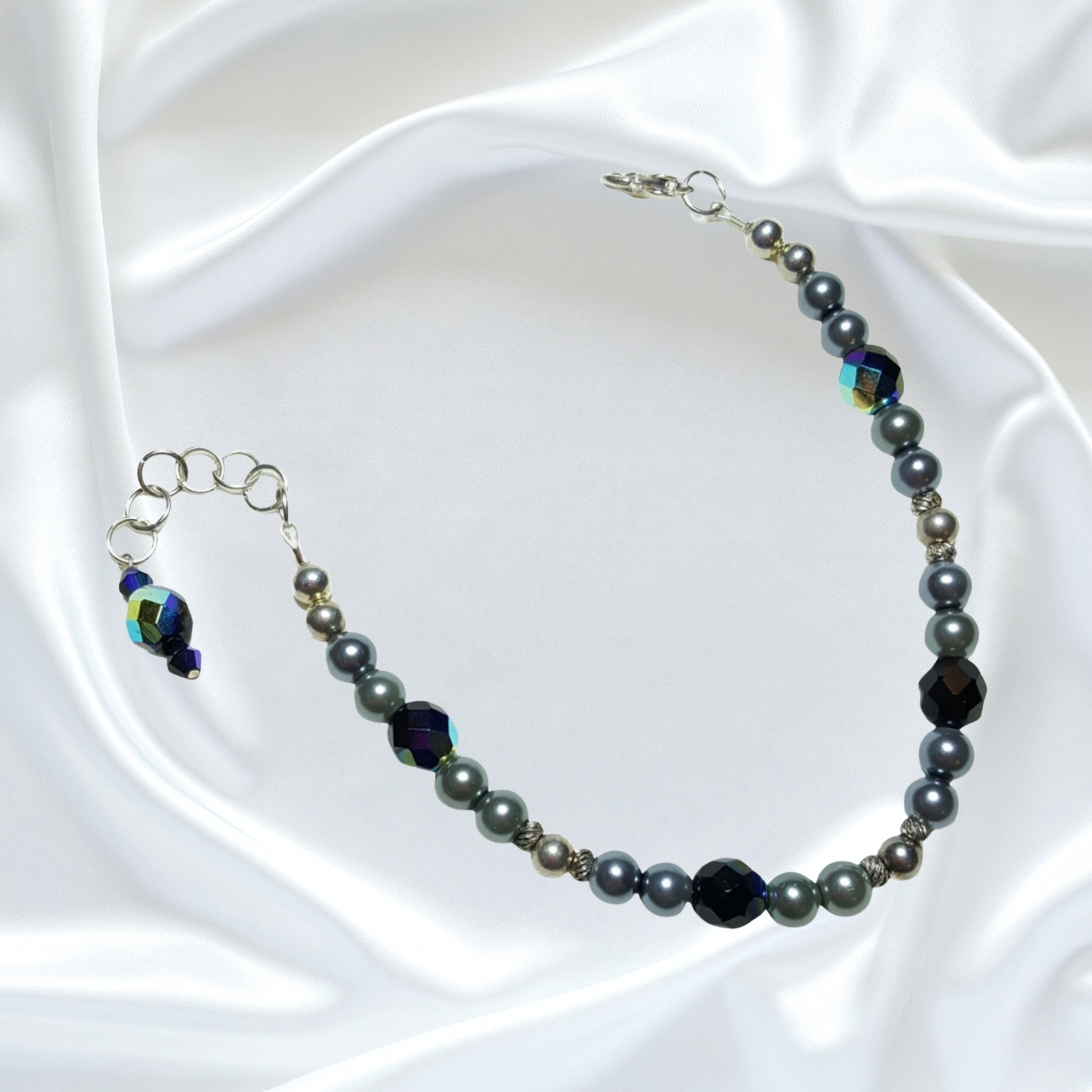 Coordinating bracelet features beautiful shimmering black crystal based pearls with jet black aurora borealis black round crystals and sterling silver bead accents.
