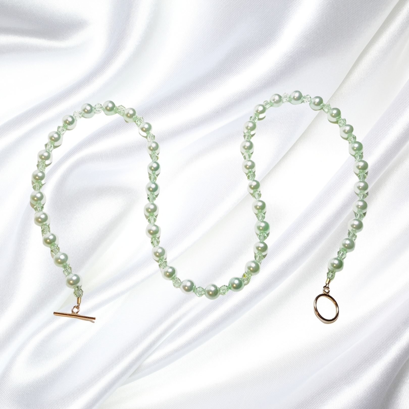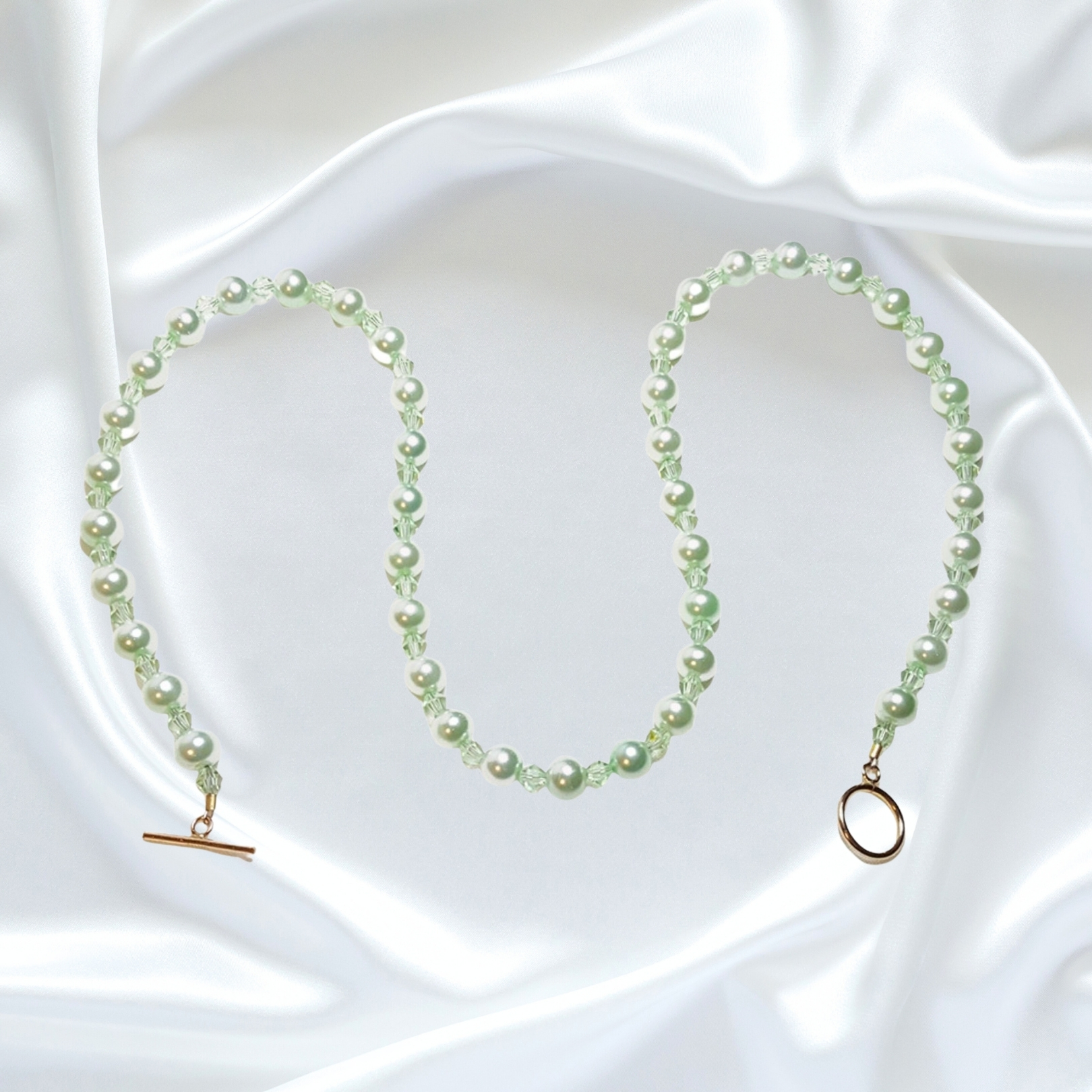✨ Fresh, luminous, and full of life — this mint green pearl and crystal set brings a breath of spring to any look. The soft glow of the pearls and the sparkle of chrysolite crystals light up pastels, crisp whites, or flowing florals effortlessly. Finished in 14K gold, it’s a radiant touch of luxury that won’t wait around for a second chance.