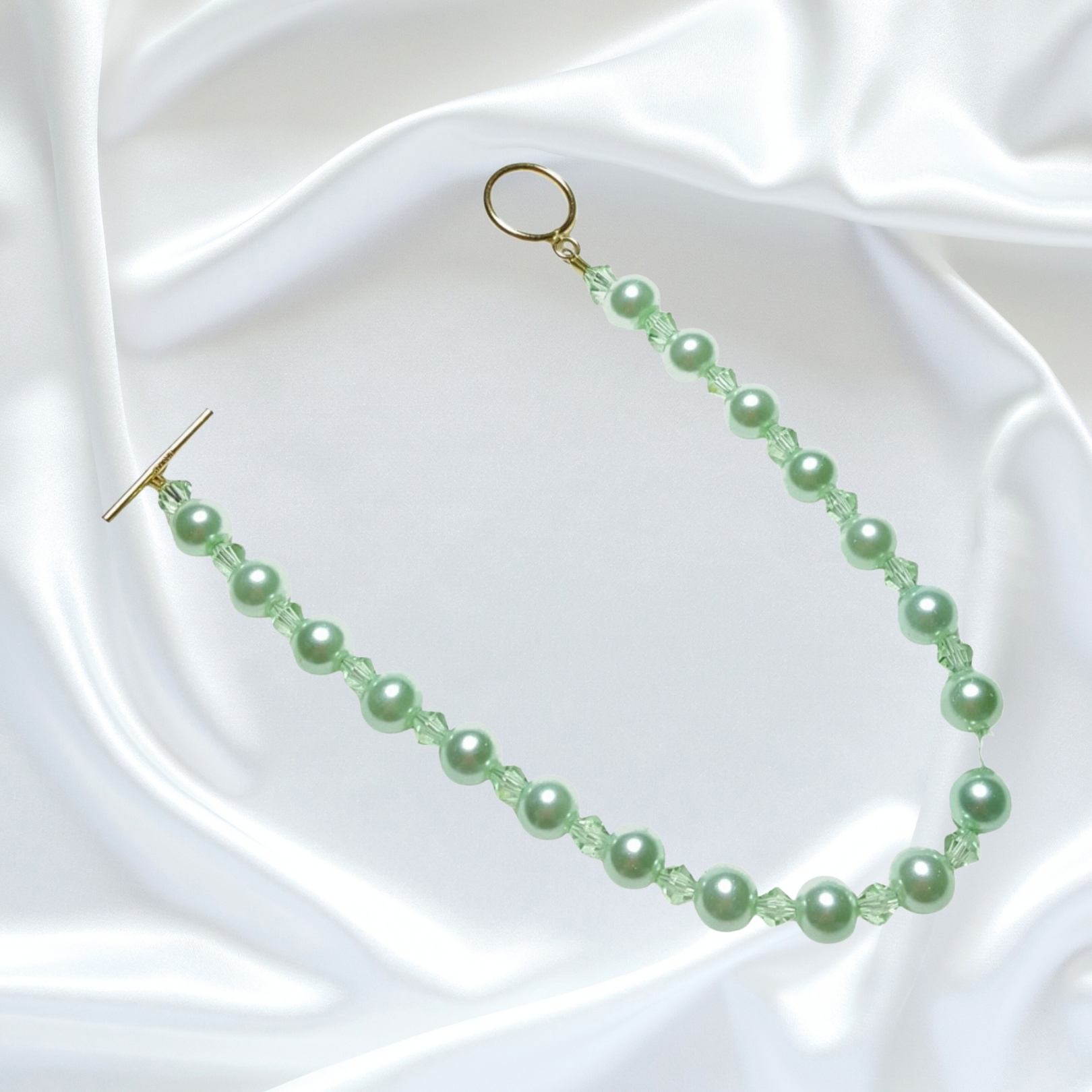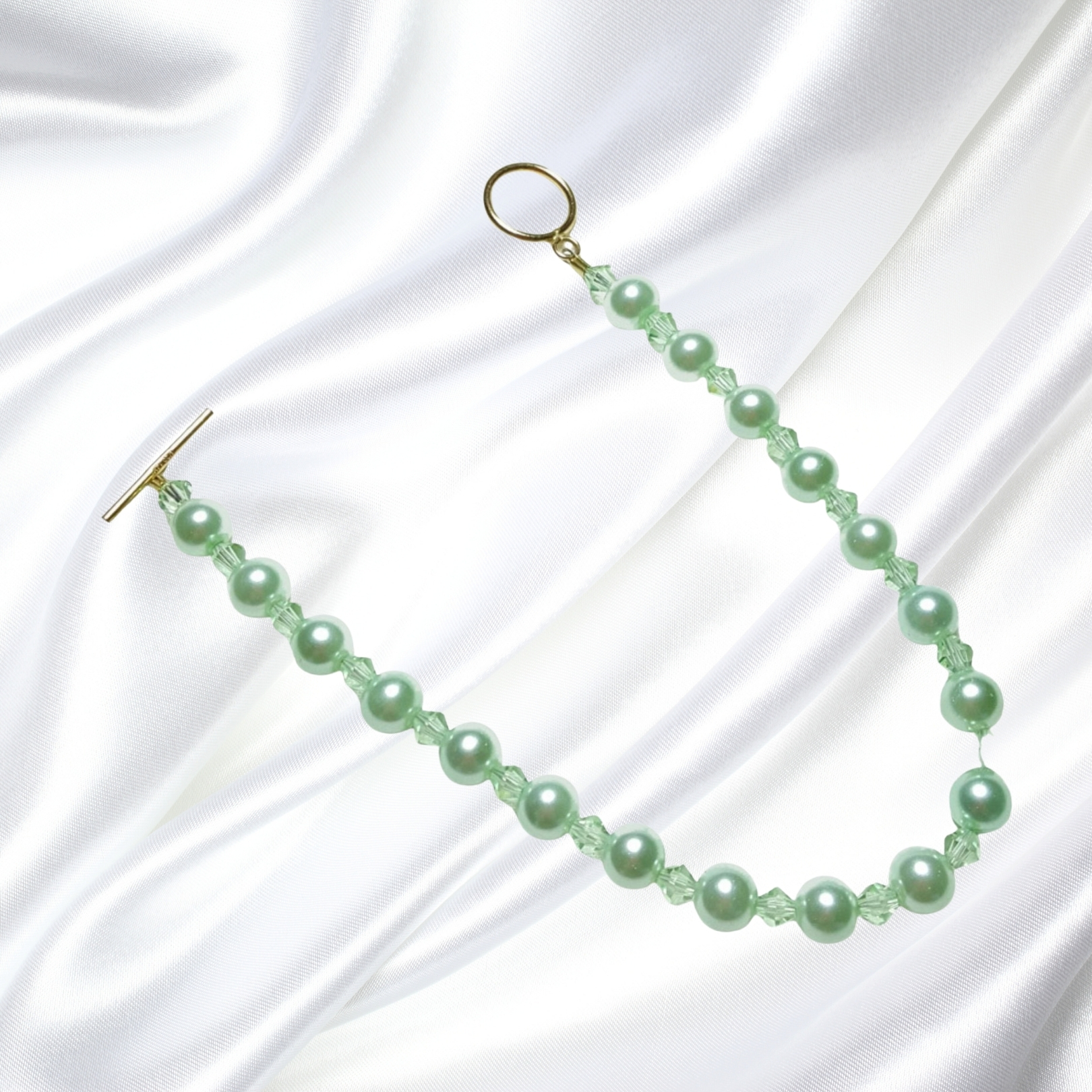 Matching bracelet features gorgeous mint green crystal based pearls and sparkling chrysolite green bicone crystals.