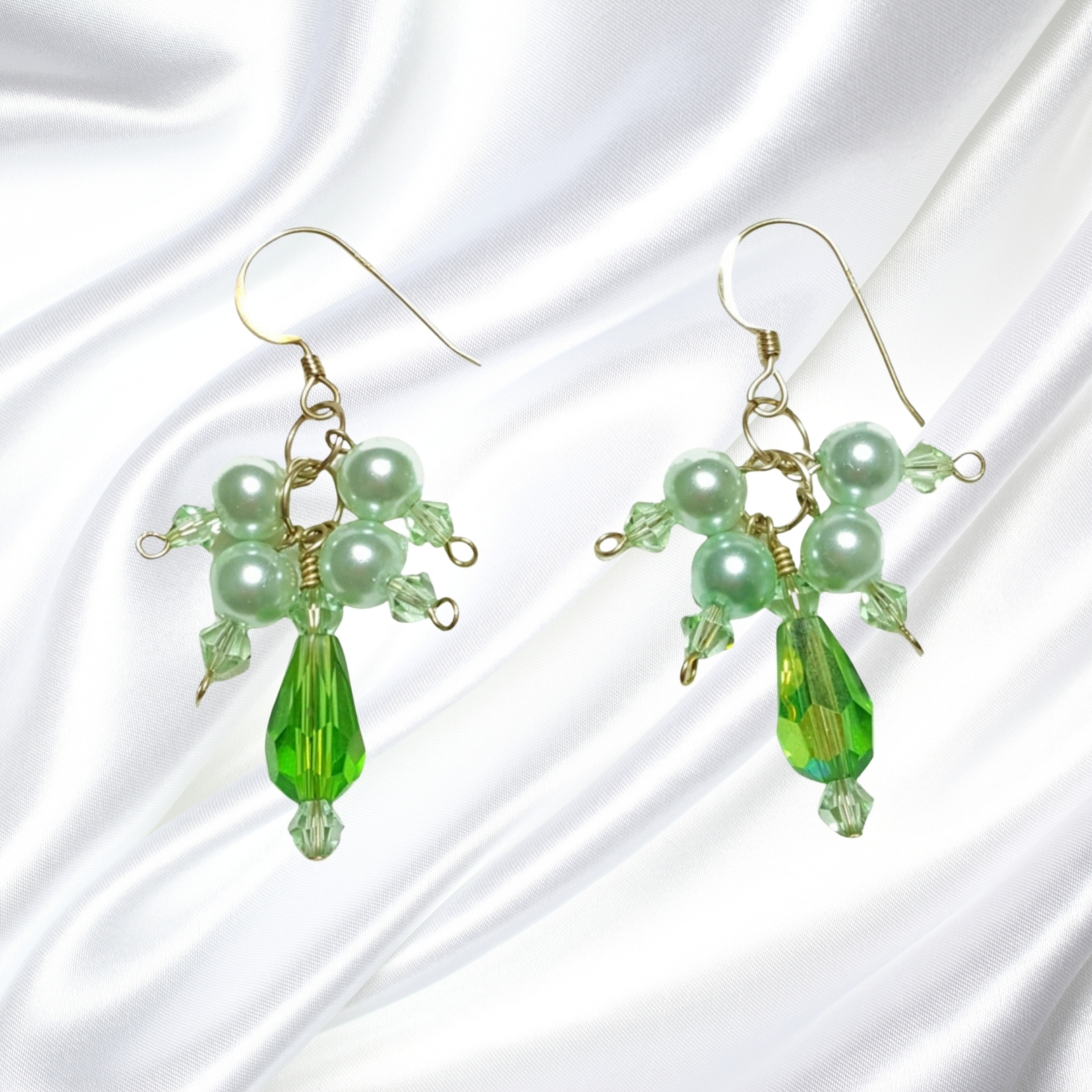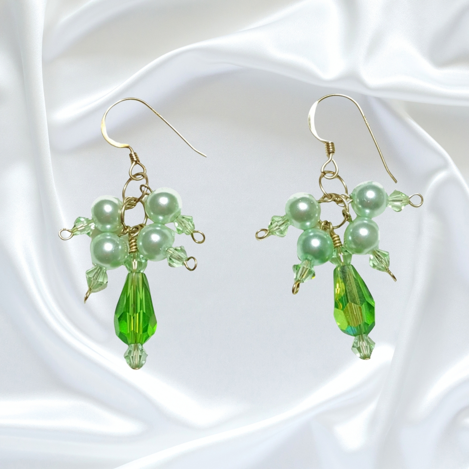 Matching earrings feature shimmering round mint green crystal based pearls are highlighted by sparkling chrysolite green Swarovski bicone crystals and a single emerald green AB finish teardrop crystal dangle for a gorgeous yet simply elegant look.