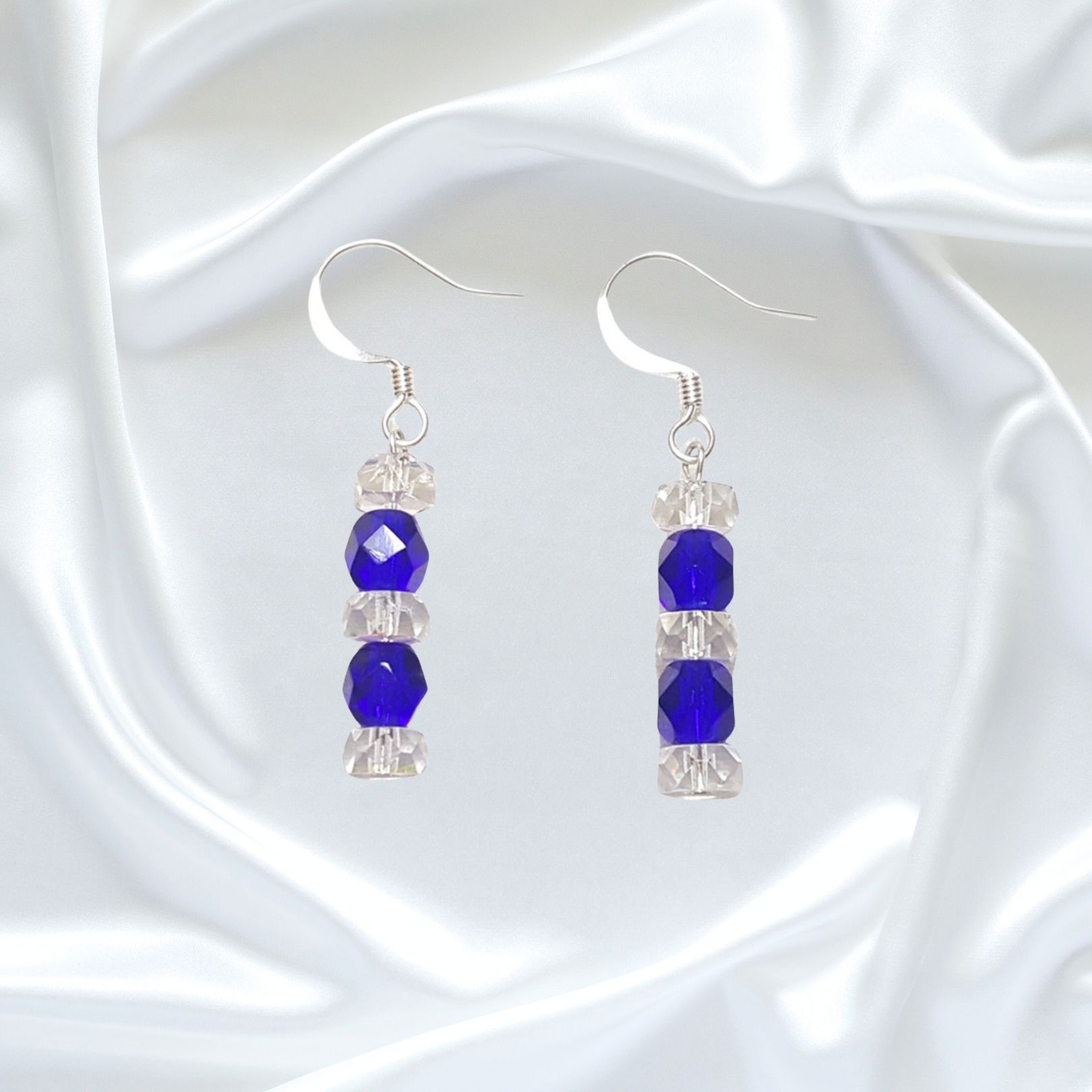 Earrings are dainty and pretty featuring sapphire blue round crystals accented by clear ice aurora borealis rondelle crystals.