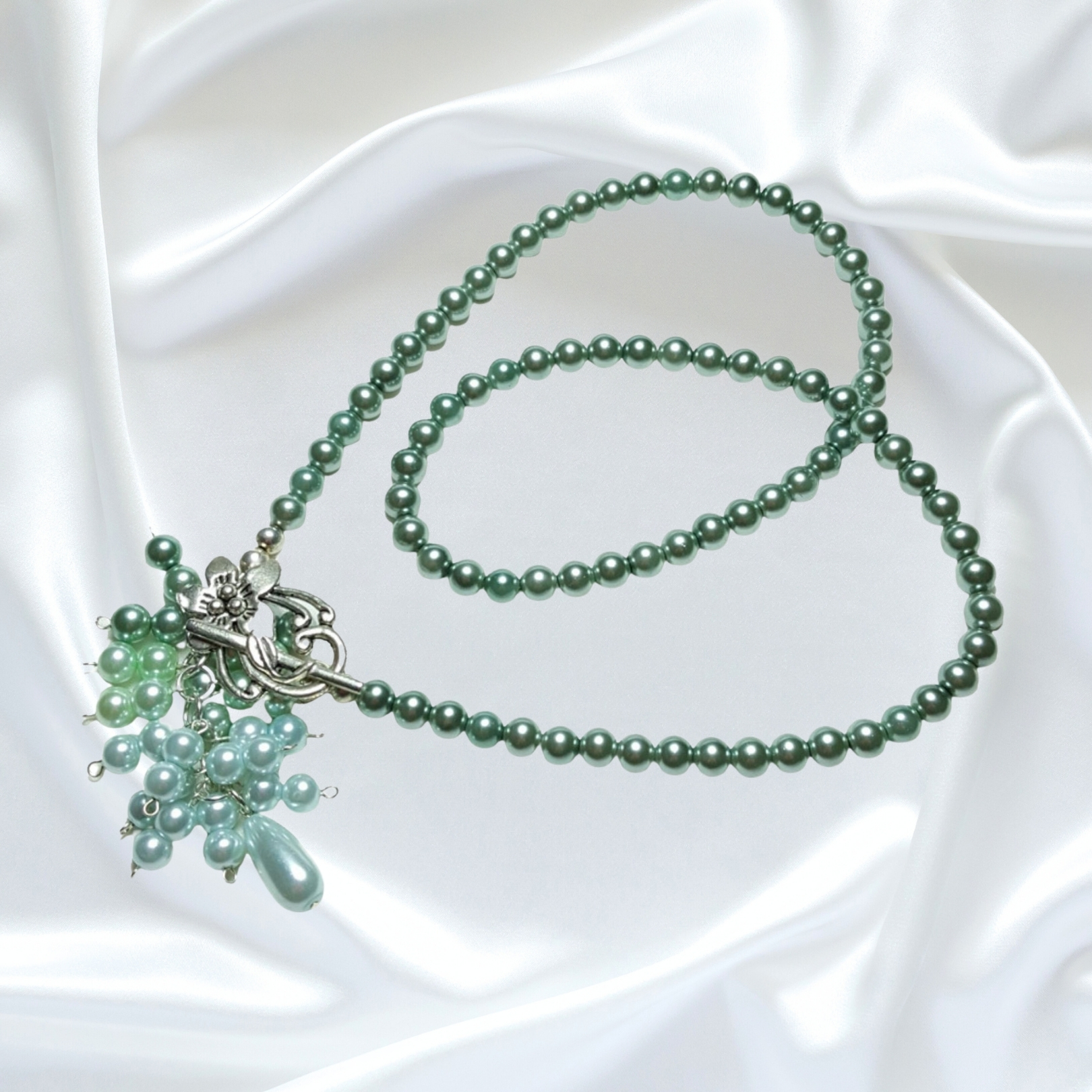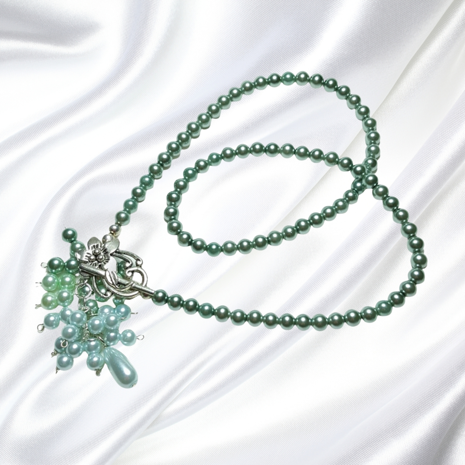 Pendant is a hand linked cluster of pearls featuring a gradient effect of teal green, mint green and light blue pearls, ending with a light blue pearl teardrop. Sterling silver chain links the pearls together.