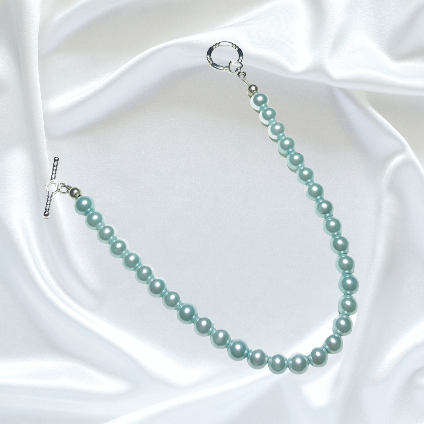 Includes 3 matching pearl bracelets – light blue, mint green and teal green pearls. Each has an antique silver toggle clasp adorned with hearts.