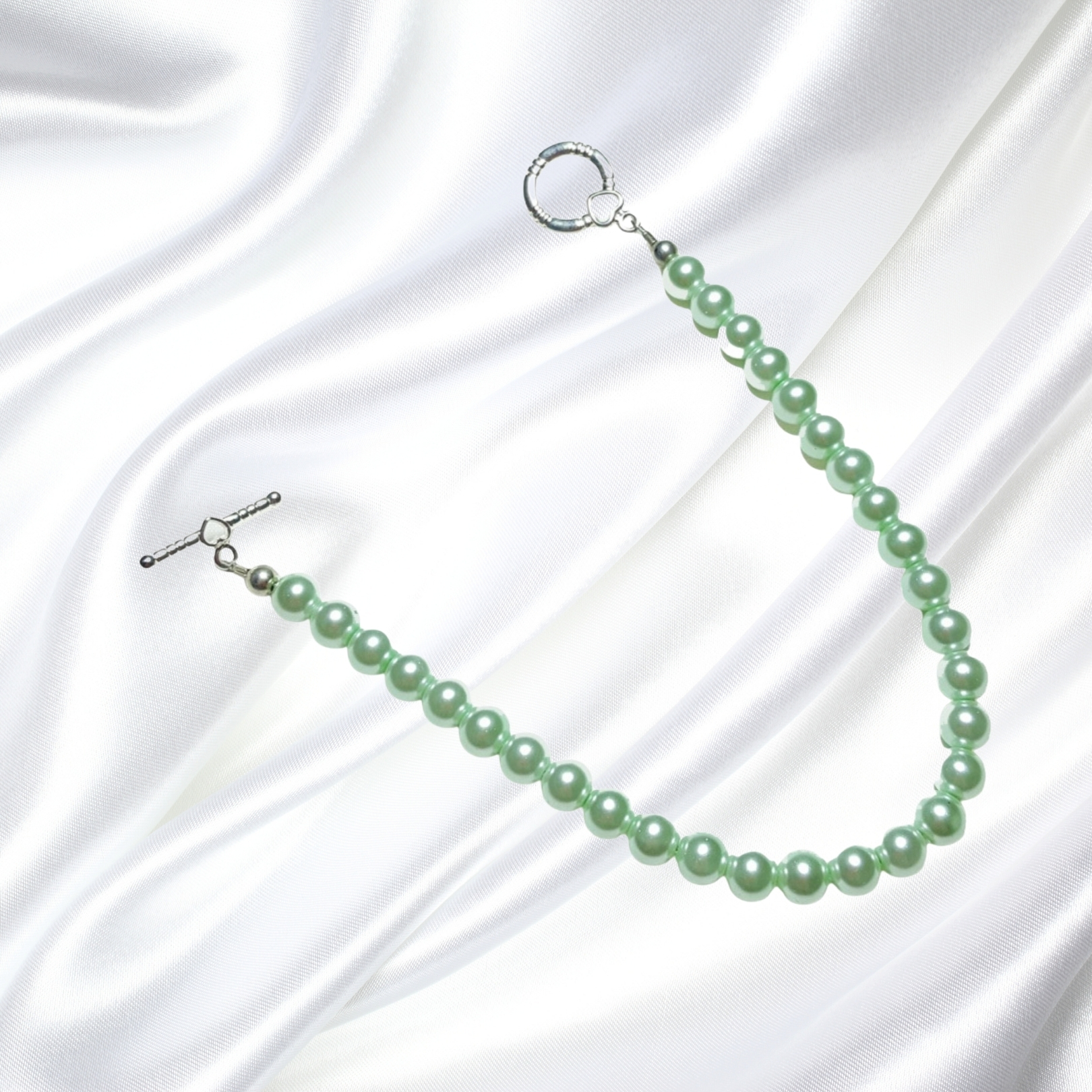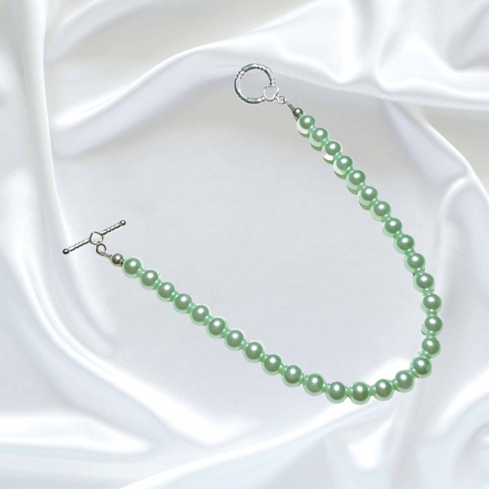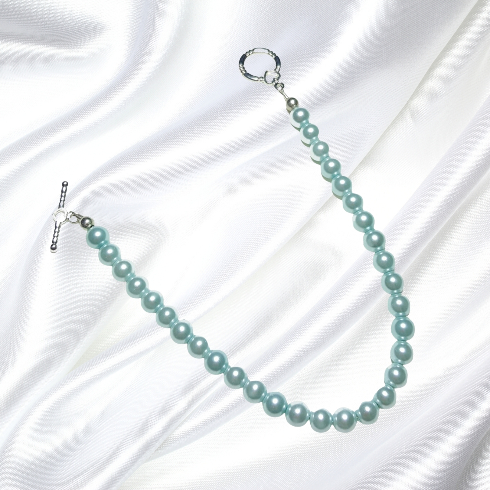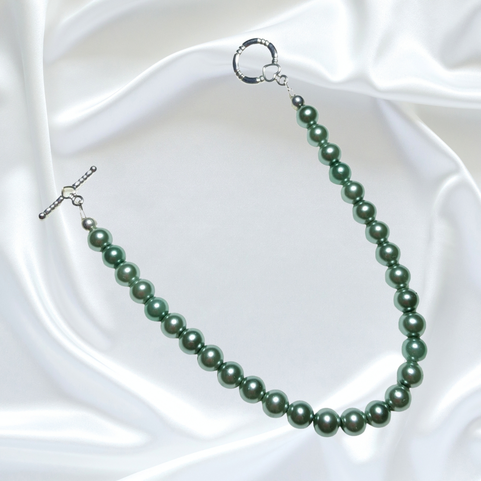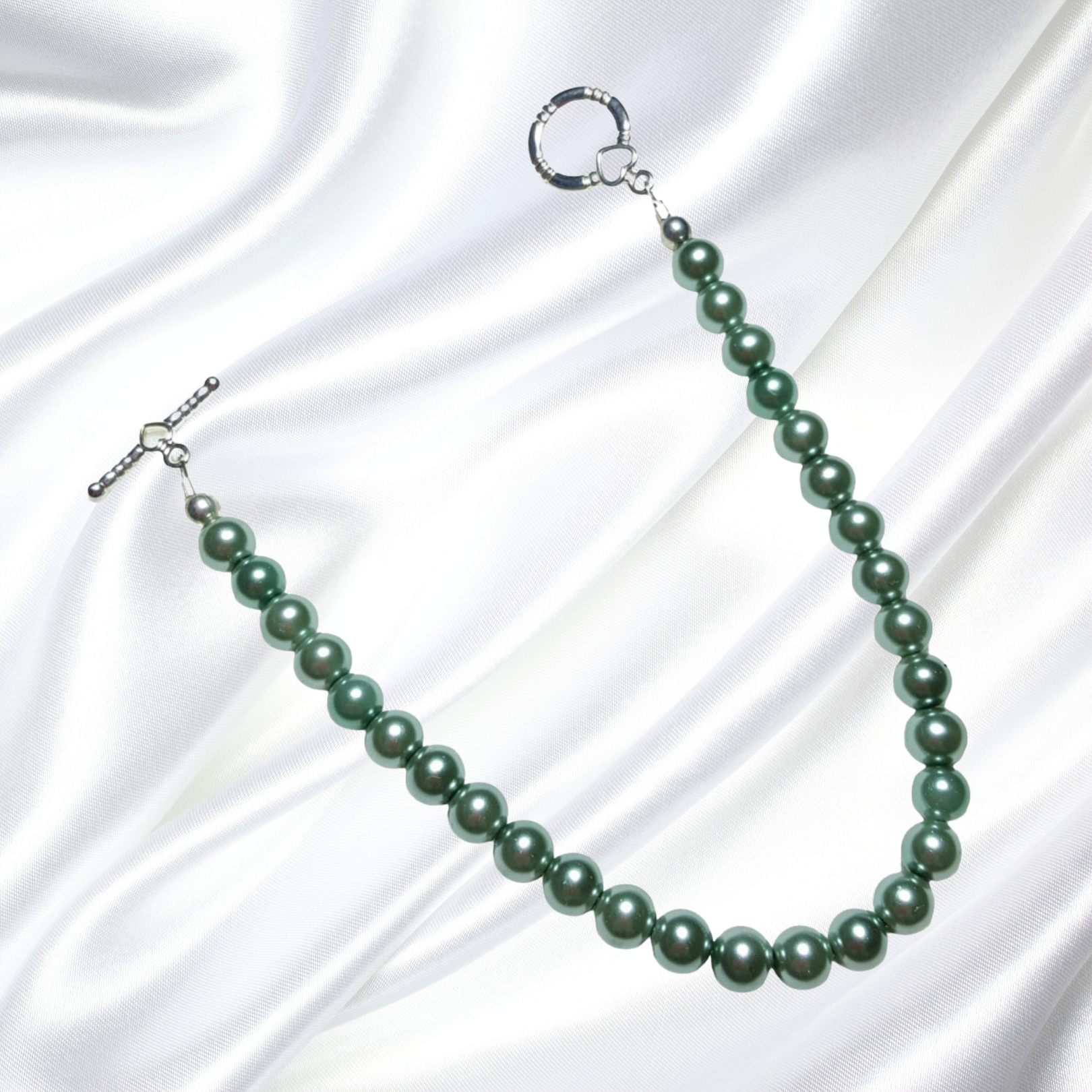 Shimmering teal green crystal based pearls form a gorgeous single strand statement necklace perfect as a wedding or bridal jewelry accessory.